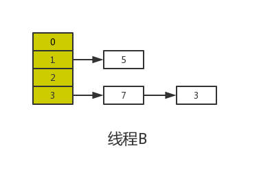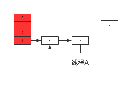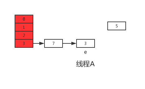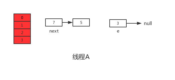 随后线程A获得CPU时间片继续执行newTable[i] = e,将3放入新数组对应的位置,执行完此轮循环后线程A的情况如下: