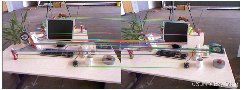 进行ORB特征提取后进行匹配的结果如下图3.3.5所示,可见该特征在匹配效果上对旋转、移动、尺度等具有良好的鲁棒性。