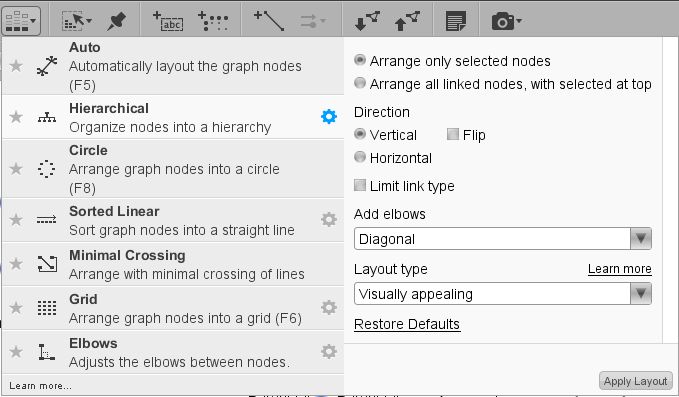 图分析应用顶部工具栏是一些和布局工具有关的按钮,工具栏中的一些按钮会影响分析图上的节点和边的布局,一些工具允许用户用文字和绘图来修饰分析图,一些则允许用户改变选择的类型,还有一些允许用户操作系统中的对象。我最常用的是自动布局选项,所以在这里我将对它做详细介绍;还有很多其他选项,我会在以后的文章中再做讨论。
