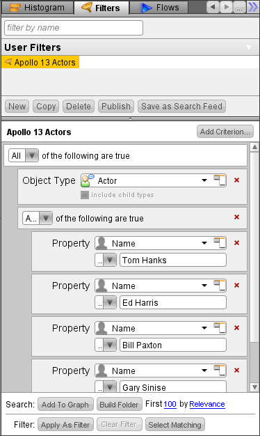 这个助手允许用户保存一些过滤器以在分析过程中应用于分析图。过滤器可以应用于过滤分析图上的数据,也可以用于将数据加载到分析图上,并且可以包含许多嵌套条件以使过滤条件相当复杂。下面的示例中,我构建了一个包含阿波罗13中的5个演员姓名的过滤器;我所选择的条件是:对象类型是演员(Actor),而姓名可以是5个可能中的一个。