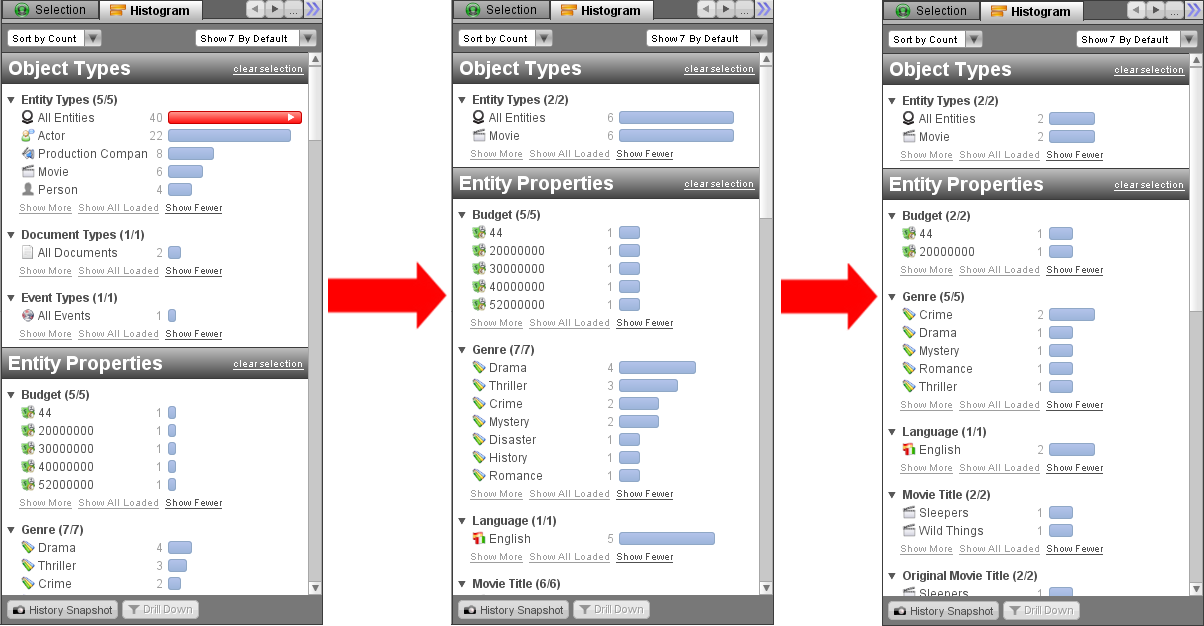 直方图使用户能够对当前分析图选中的对象进行自顶而下分析。如果用户对直方图进行选择并向下钻取,则分析图上的选项更改而且更新直方图显示的内容。例如,用户选择包含混合对象的分析图的一部分,然后使用直方图只选择类型为movie的实体,然后只选择那些类型属性为“Crime”的电影。