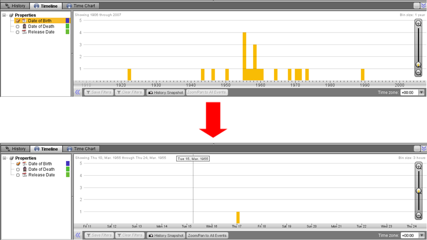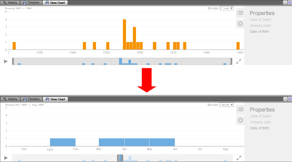 如果分析图中的对象具有日期元数据或包含日期属性,那么这些将在时间线助手的左侧显示出来。选择对象或属性将会更新时间线视图,以显示在时间范围内事件发生的次数,因为用户在范围内的缩放会更加细化并显示更高级别的细节。这个例子展示了在分析图上演员的出生日期,上面是缩小版下面是放大版。
