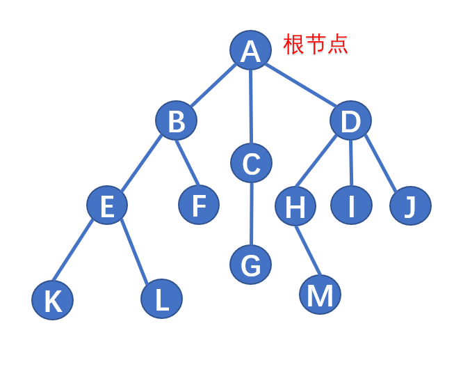 - 叶子结点:也叫作终端节点,指度为0,也就是下面没有分支、子树的结点。如F,G,I,J,K,L,M都是叶子结点。