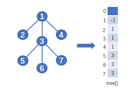 如上图,用数组下标表示树中的结点,数组元素的内容就表示该节点的双亲结点,这样有了结点(下标)以及结点直接的关系(内容),就可以表示一棵树了。比如下标5的内容为3,说明节点5的双亲结点为3;下标1处的结点内容为-1,说明1为根节点。