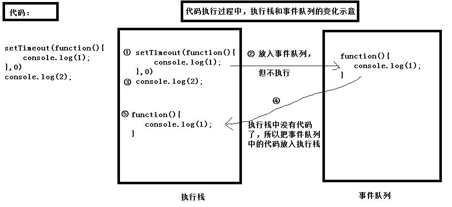 即:执行栈存放所有要执行的函数(代码),事件队列中存放所有的异步任务,如果执行栈中的代码执行完毕后,才会把事件队列中的事件(所有异步的代码)放入执行栈,接着执行。