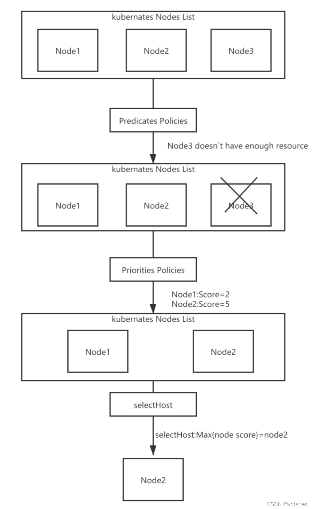 预选(Predicates):输入是所有节点,输出是满足预选条件的节点。kube-scheduler根据预选策略过滤掉不满足策略的Nodes。例如,如果某节点的资源不足或者不满足预选策略的条件如“Node的label必须与Pod的Selector一致”时则无法通过预选。