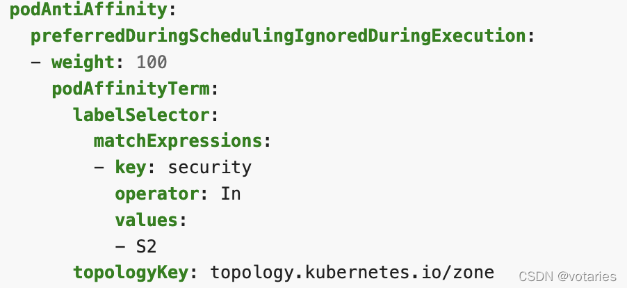 该函数提供两种选择器:requiredDuringSchedulingIgnoredDuringExecution(硬亲和)和preferredDuringSchedulingIgnoredDuringExecution(软亲和)。前者是强要求,指定将Pod调度到节点上必须满足的所有规则;后者是弱要求,即尽可能调度到满足特定限制的节点,但允许不满足。