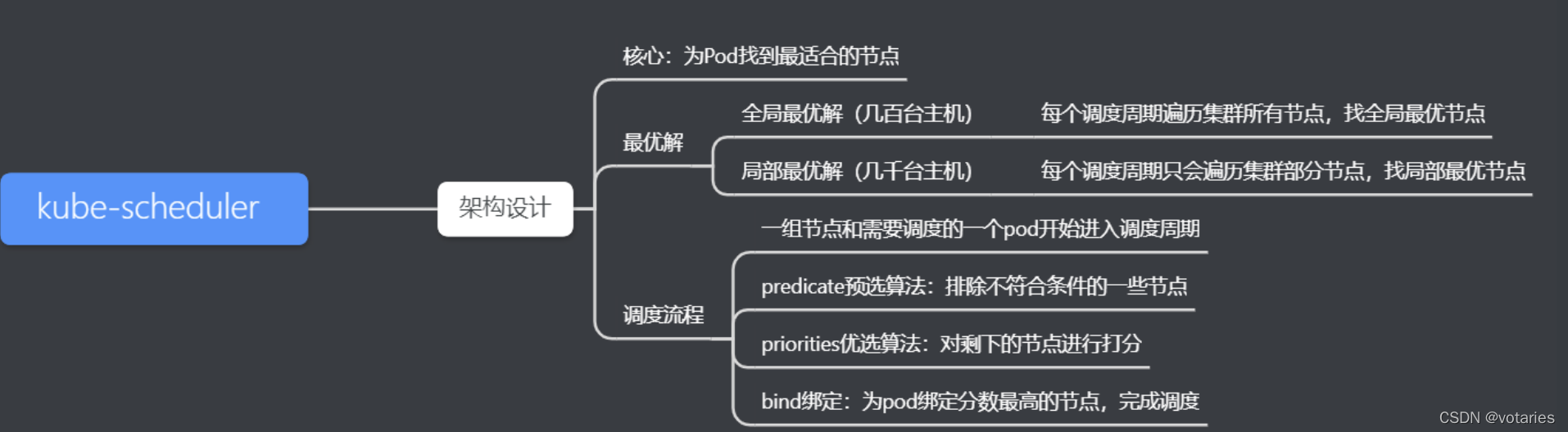 kube-scheduler的根本工作任务是根据各种调度算法将Pod绑定(bind)到最合适的工作节点,整个调度流程分为两个阶段:预选策略(Predicates)和优选策略(Priorities)。