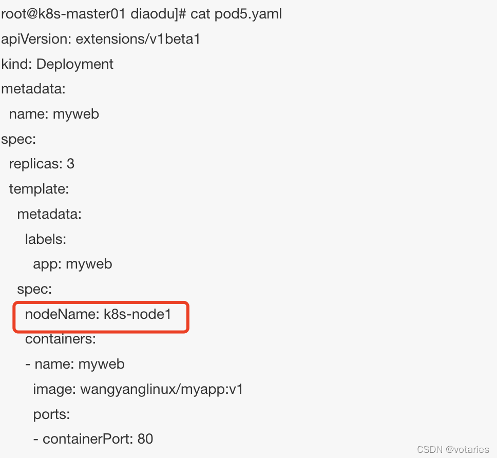 根据node节点的主机名选择 Pod.spec.nodeName 将 Pod 直接调度到指定的 Node 节点上,会跳过 Scheduler 的调度策略,该匹配规则是强制匹配