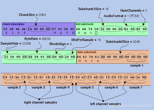 图中ByteRate(88200) = BitsPerSample(16) / 8 * SampleRate(22050)*NumChannels(2)