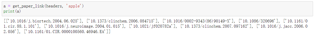 return doi_list【注】调用上一个代码块中的get_paper_link()函数,传入参数为“请求头”和“关键词”。