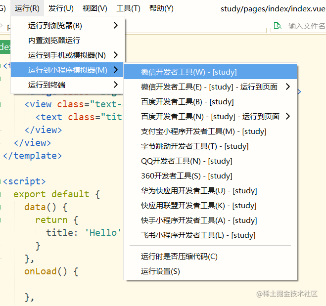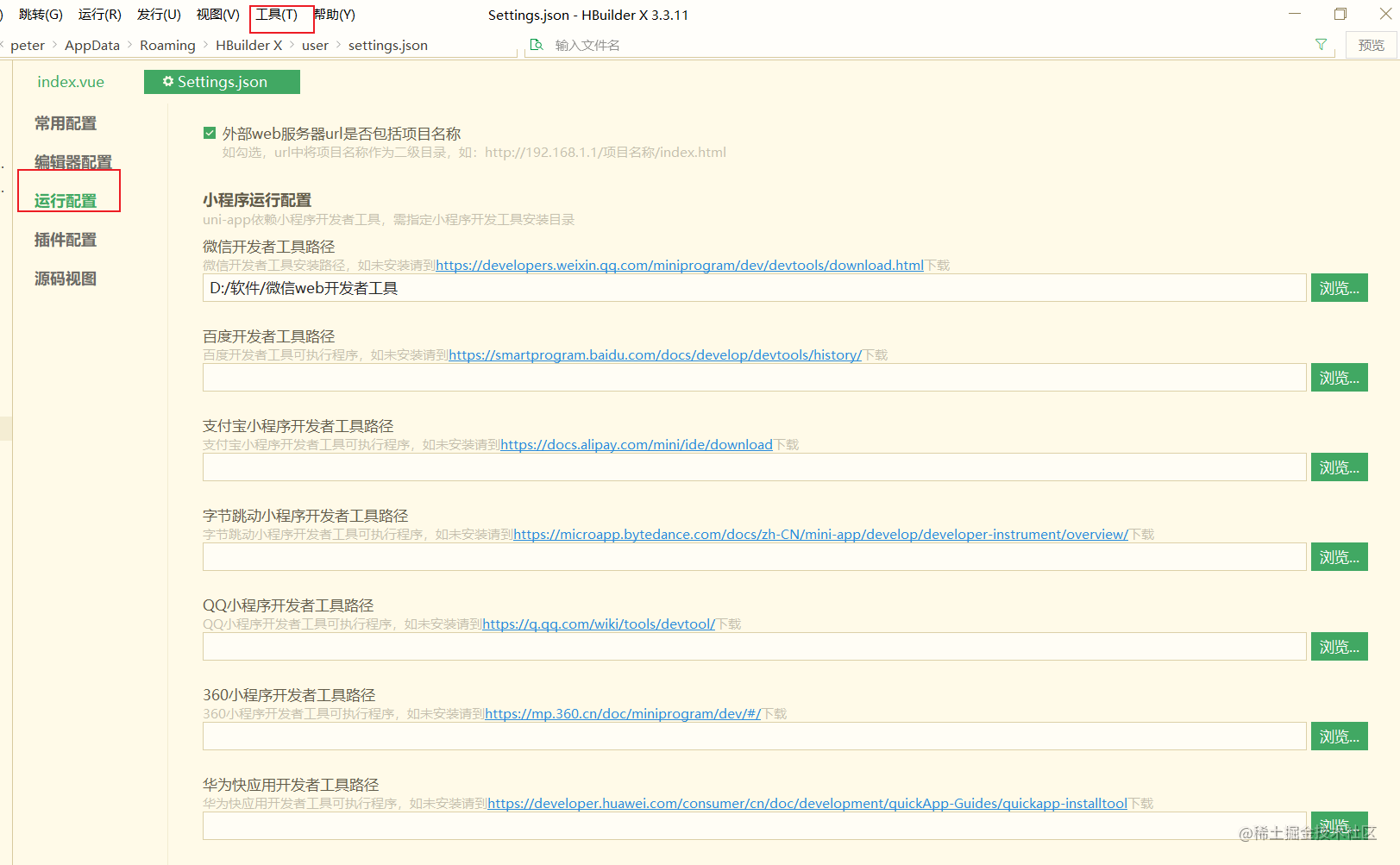 在工具的设置中去配置开发者工具的路径,这样运行的时候就会自动打开了。其他小程序配置也都在里面