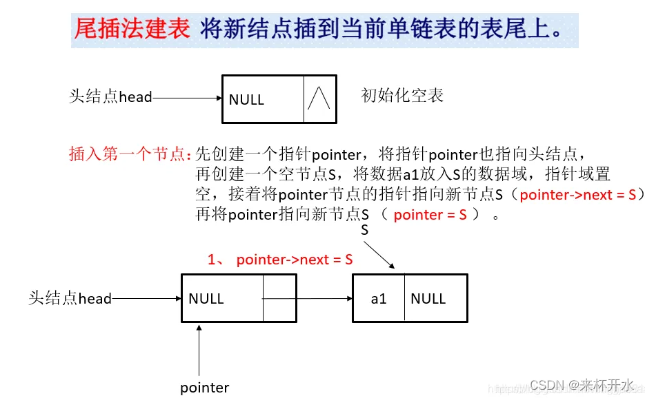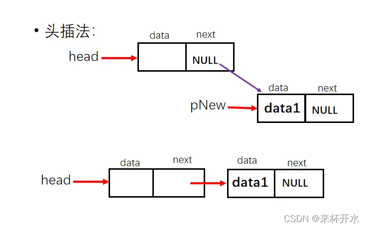 - 头插法:从一个空表开始,重复读入数据,生成新节点,将读入的数据域存放到新结点的数据域中,然后将新结点插入到当前链表的表头结点之后,直至读入结束为止