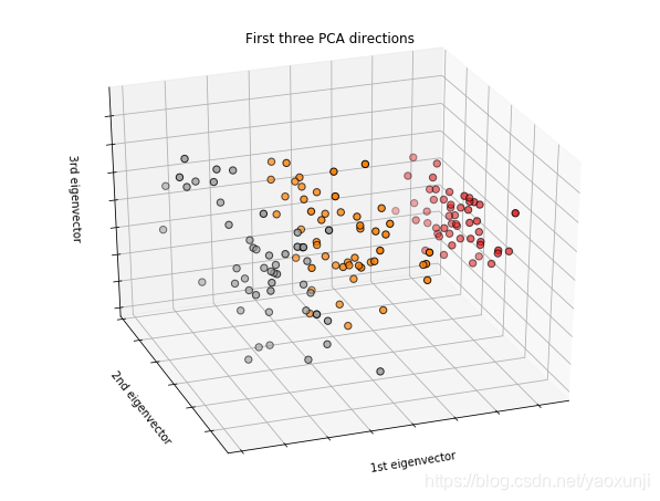 在把这个数据集在的前三个属性在三维空间中绘制出来。