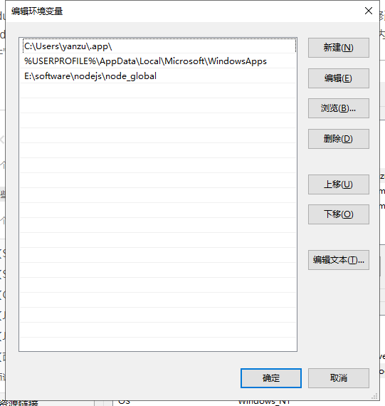 由于改变了module的默认地址,所以上面的用户变量都要跟着改变一下(用户变量”PATH”修改为“E:\software\nodejs\node_global”),要不使用module的时候会导致输入命令出现“xxx不是内部或外部命令,也不是可运行的程序或批处理文件”这个错误。