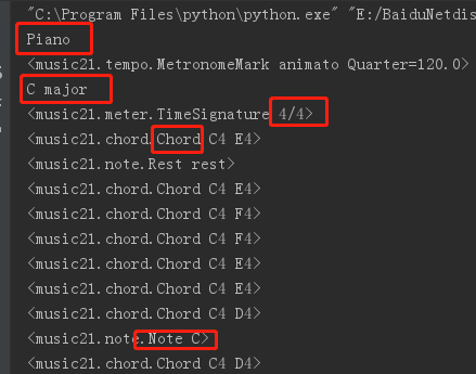 return Notes先读取第一个文件测试看看,可以看到乐器是piano,C major调,4/4拍,还有Note和Chord的信息
