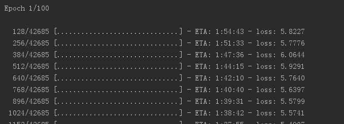 model.fit(network_input, network_output, epochs=100, batch_size=128, callbacks=callbacks_list) #整体迭代100次,每小批128个