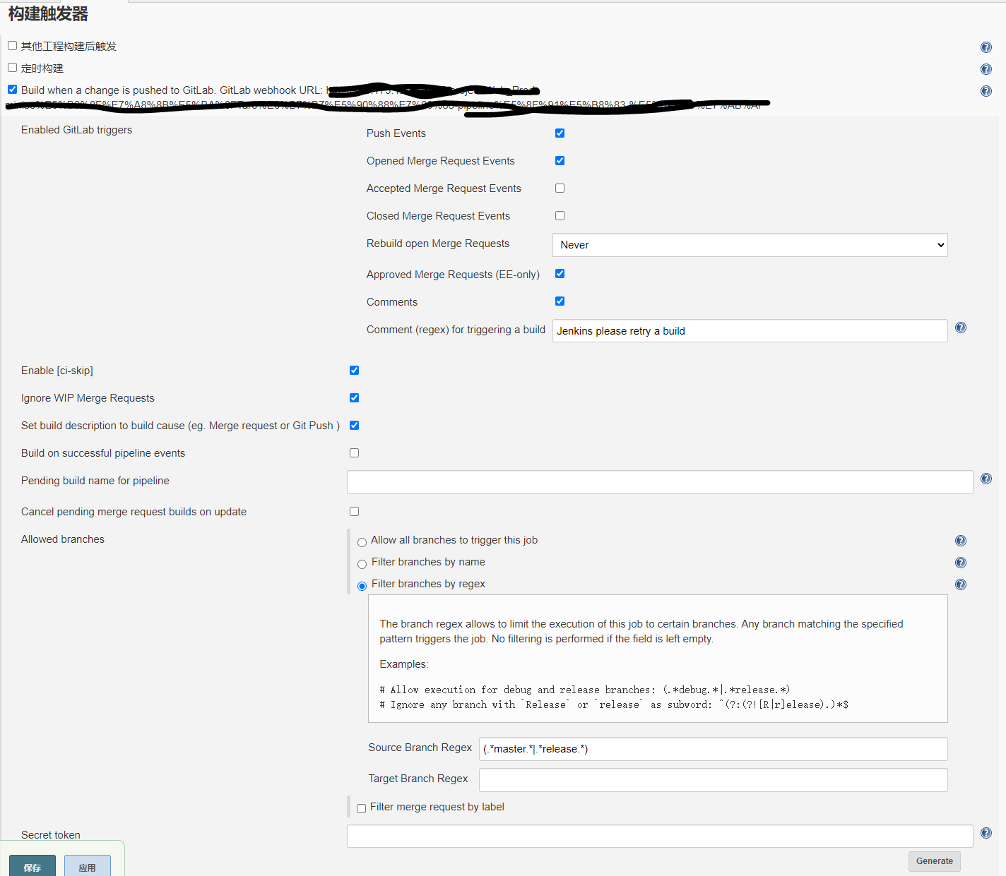 点击生成之后将secret token保存。之后打开gitlab,把配置好的地址和token粘贴上去,同时点击新建tag的时候也会触发构建器。