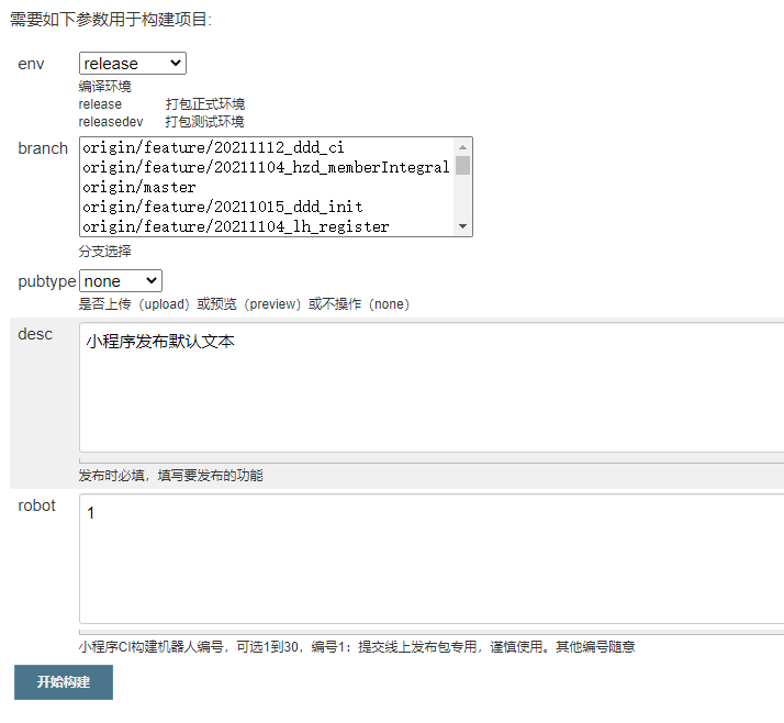 node CI/index.js type=$pubtype branch=$branch desc=$desc version=$version robot=$robot之后开发和测试的同学,在需要对某个分支进行上传或者预览的时候,填写一下配置即可:
