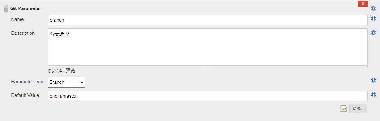 之后在General上,添加参数,选择Git Parameter。在Git Parameter为了和上面源码管理里的$branch保持一致,name这里得填branch,然后选择默认的分支。