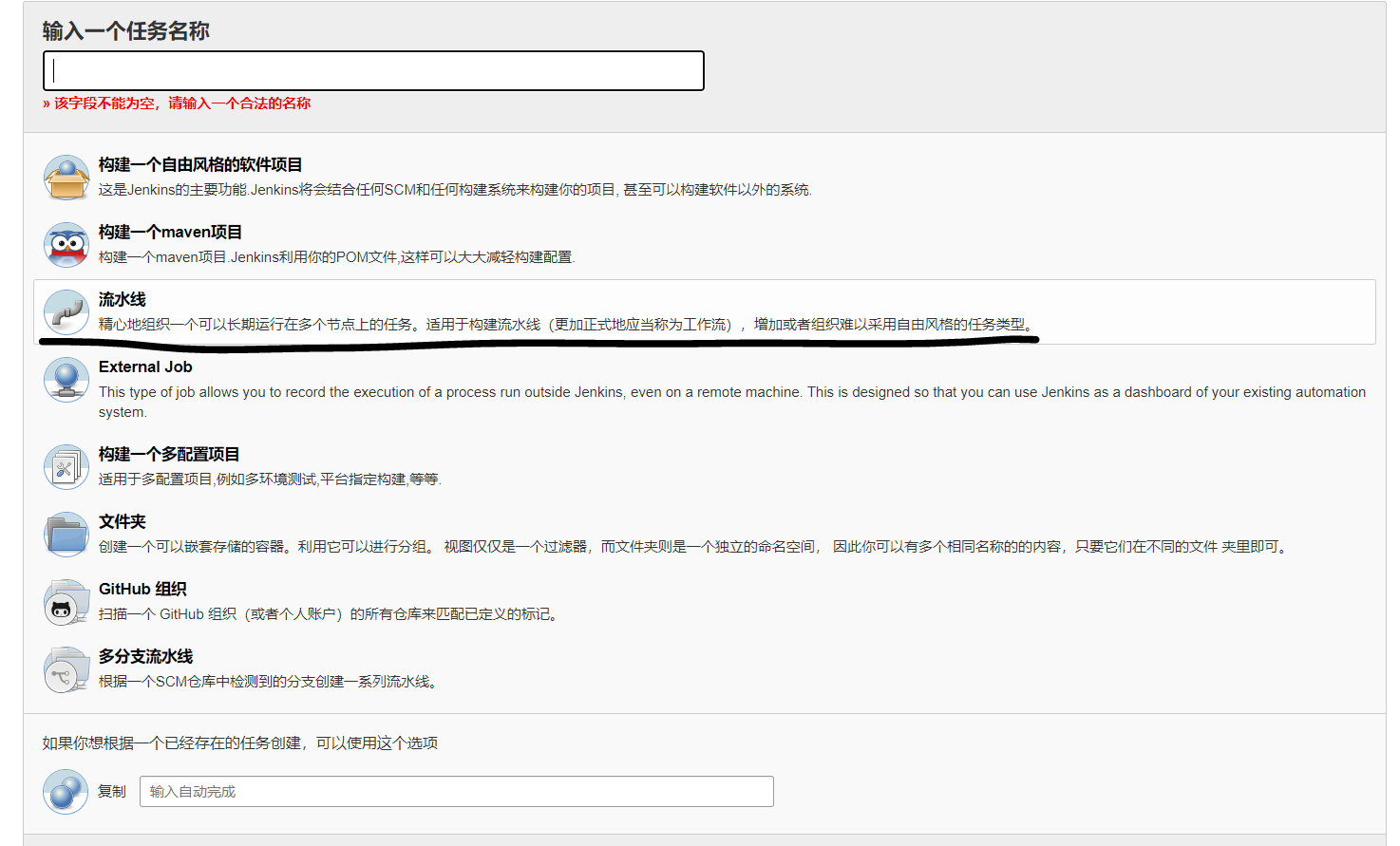 首先在jenkins里选择流水线任务。