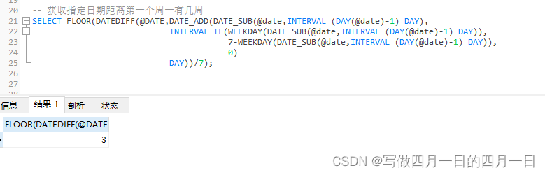 DAY);获取到第一个周一以后的事情就方便了,FLOOR((输入的日期-第一个周一的日期)/7)就可以知道距离第一周有几周