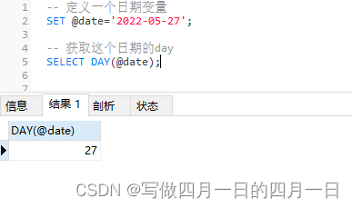 SET @date='2022-05-27';我们知道DAY()函数可以返回一个日期是当月的第几天,如'2022-05-27'返回的结果是27: