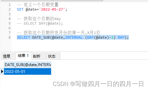 然后我们就可以获取到这个月的第一天,就是@date减去(它的day-1),这个工作可以交给DATE_SUB()函数完成: