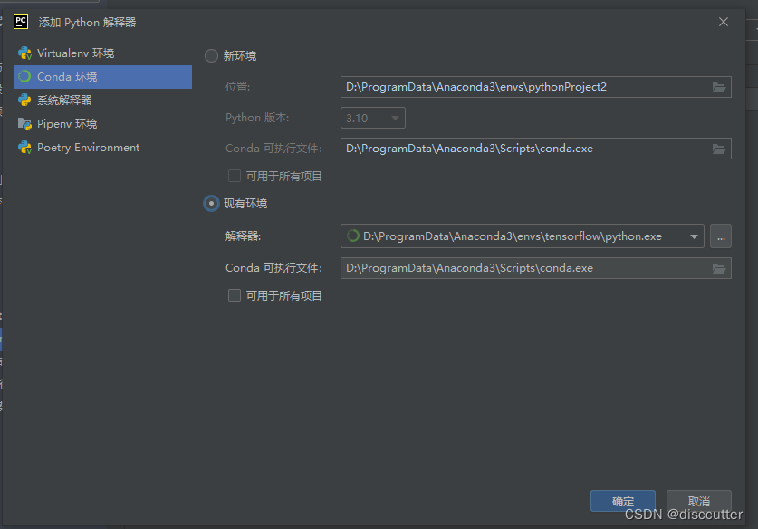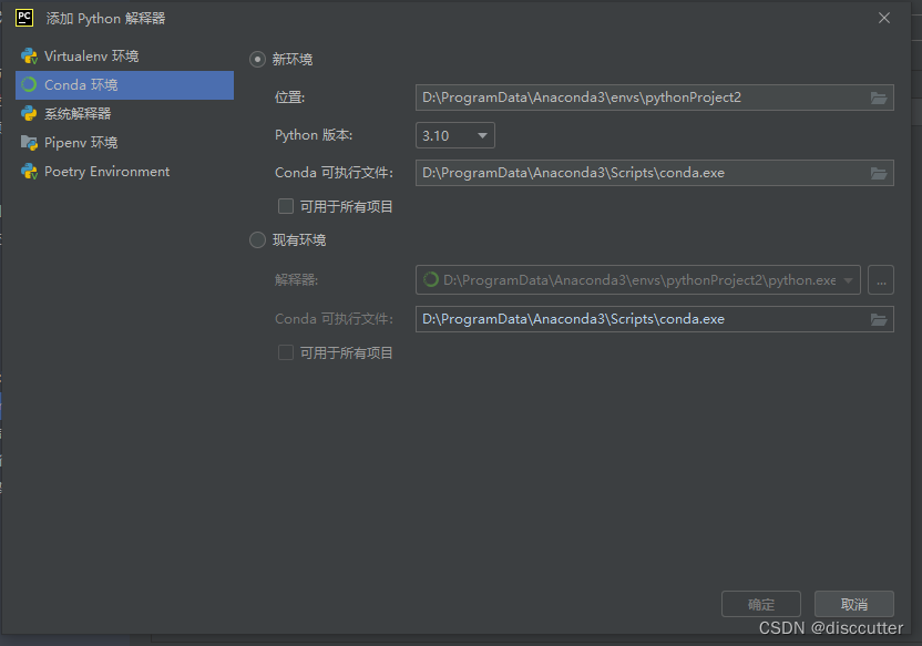 4.在conda环境,添加新环境,选择python版本,主要是在执行文件处,加入conda.exe