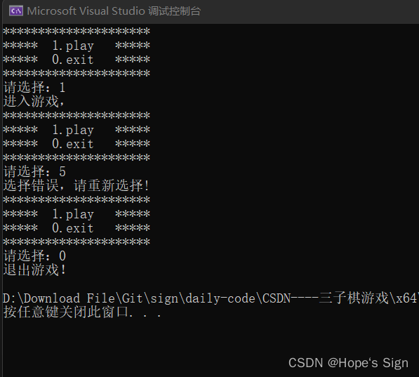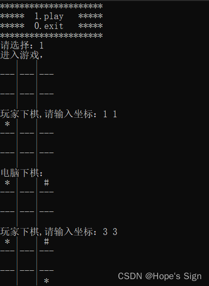}三子棋游戏代码到这里已经全部完成了,看运行效果