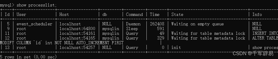 在进行mvcc操作的时候,当开启一个事务,实际上就会产生一个快照,然后在另一个session中进行修改表操作,此时就会产生此种问题。