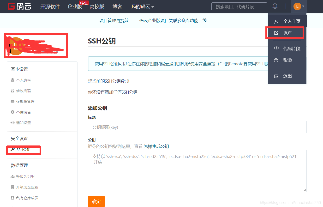 进入码云后,点击你头像下的设置,进入设置界面后进入ssh公钥,进行设置,将刚复制的公钥放入弓腰输入框,点击提交即可!