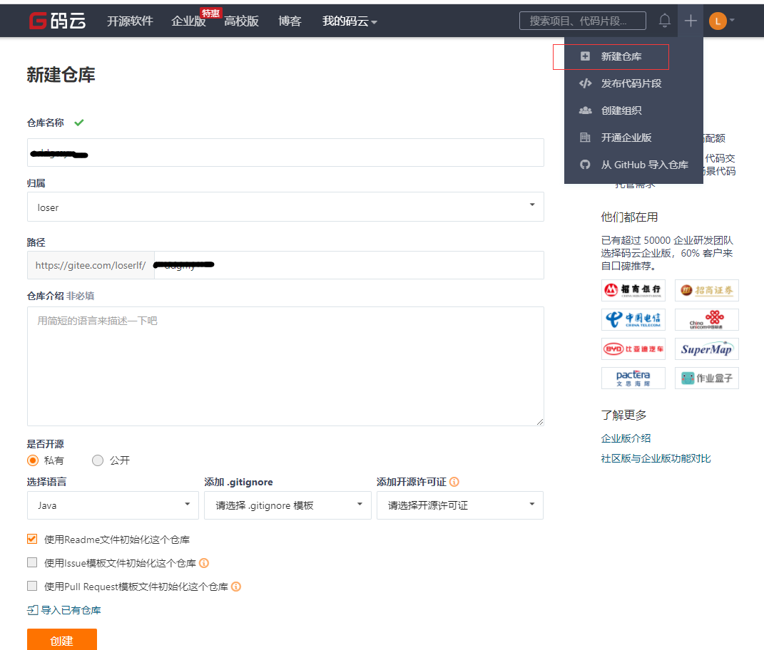 点击头像旁边的加号,新建仓库,基本只要输入仓库名和你要提交的代码里类型就很好。