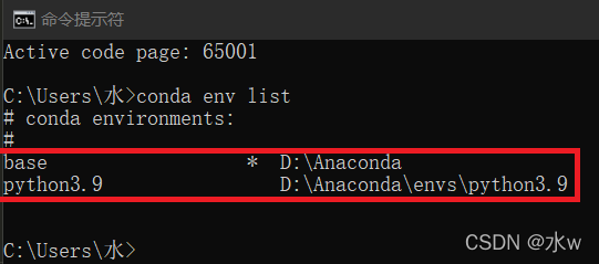 或者打开已经创建好的conda虚拟环境,可以在本地cmd中输入命令查看有哪些虚拟环境: