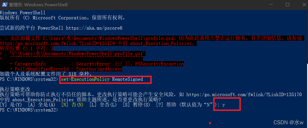 set-ExecutionPolicy RemoteSigned然后中途会让输入y,回车确定执行命令: