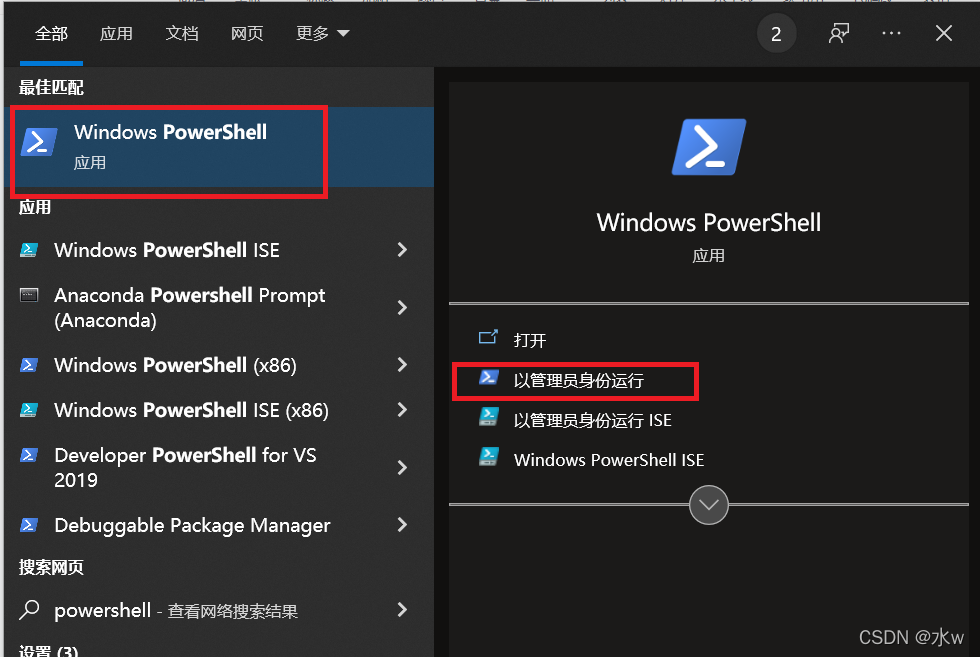 2、打开电脑Windows的开始界面,然后直接搜索关键字powershell ,打开第一个Windows PowerShell: