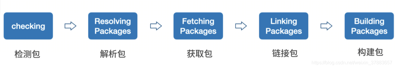 检测(checking)→ 解析包(Resolving Packages) → 获取包(Fetching Packages)→ 链接包(Linking Packages)→ 构建包(Building Packages)