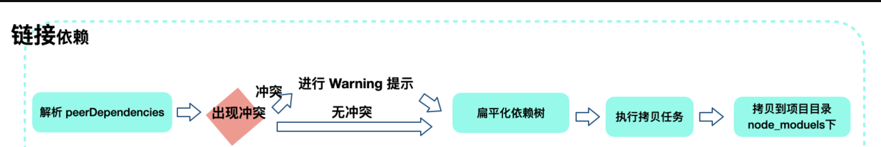 - 链接包(Linking Packages):将项目中的依赖复制到项目 node_modules 下,同时遵循扁平化原则。在复制依赖前,Yarn 会先解析 peerDependencies,如果找不到符合 peerDependencies 的包,则进行 warning 提示,并最终拷贝依赖到项目中。