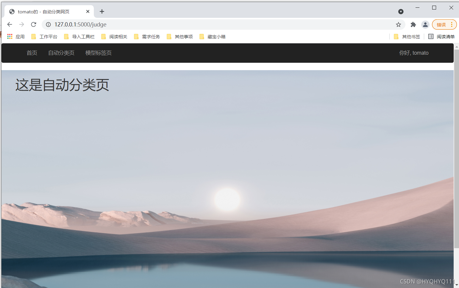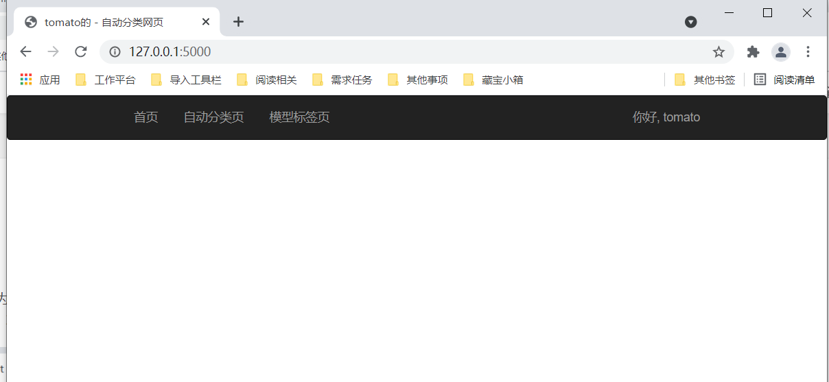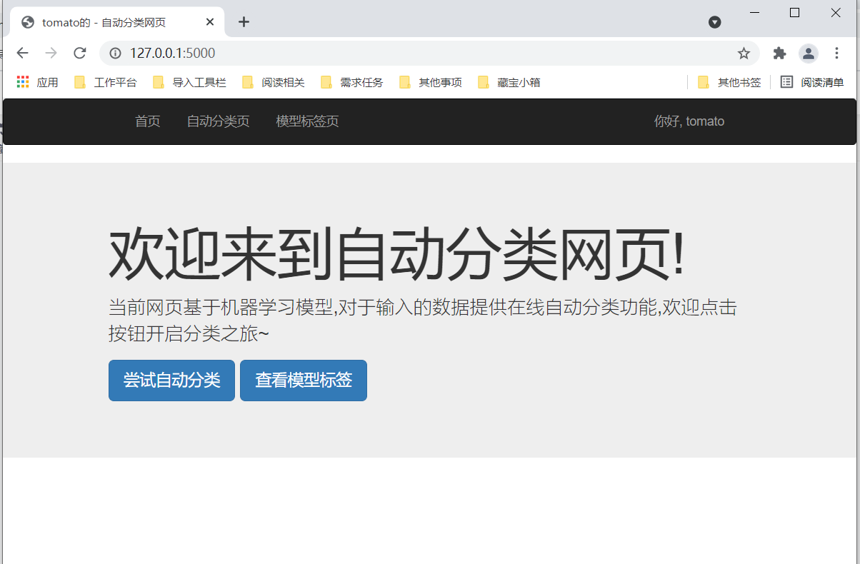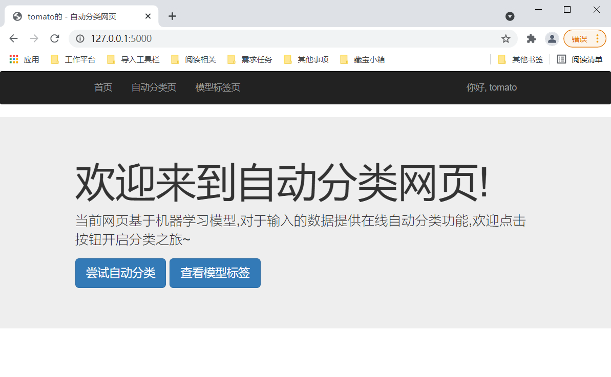 但是因为/judge和/model我们还没有写,因此点击导航栏中 "自动分类页“” 和 "模型标签页" ,页面会报错,不用慌,慢慢完善
