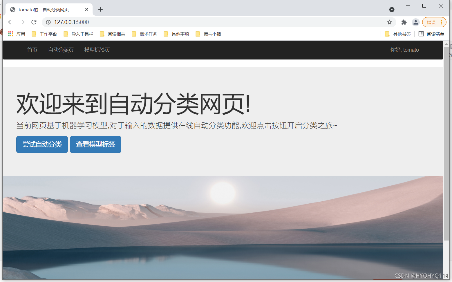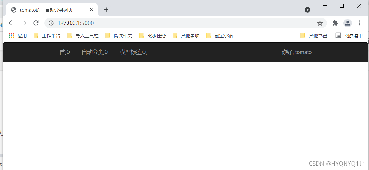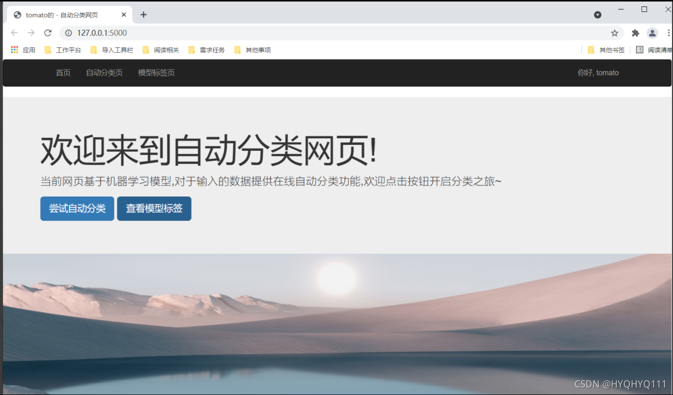 但是因为/judge和/model我们还没有写,因此点击导航栏中 "自动分类页“” 和 "模型标签页" ,页面会报错,不用慌,慢慢完善