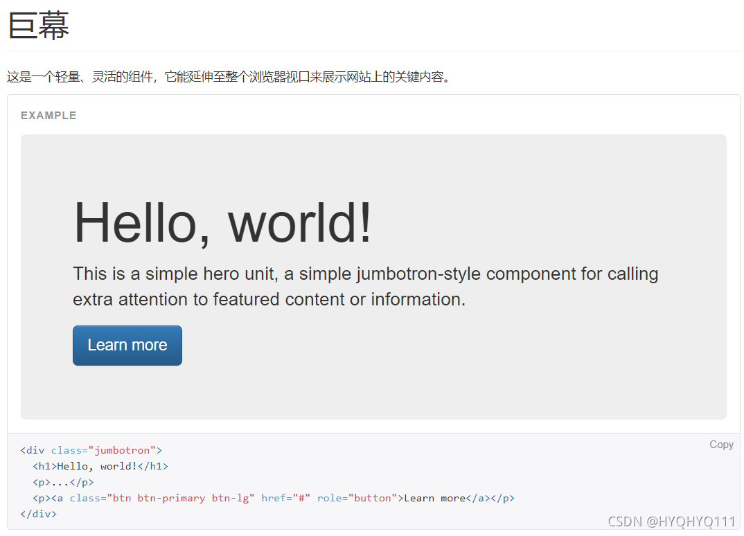 看起来bootstrap提供了一个叫做jumbotron的class,在页面中插入这段代码就可以使用巨幕组件,巨幕适用于需要醒目的标题或介绍,图片元素较少的着陆页,对于当前网页中还挺实用的。