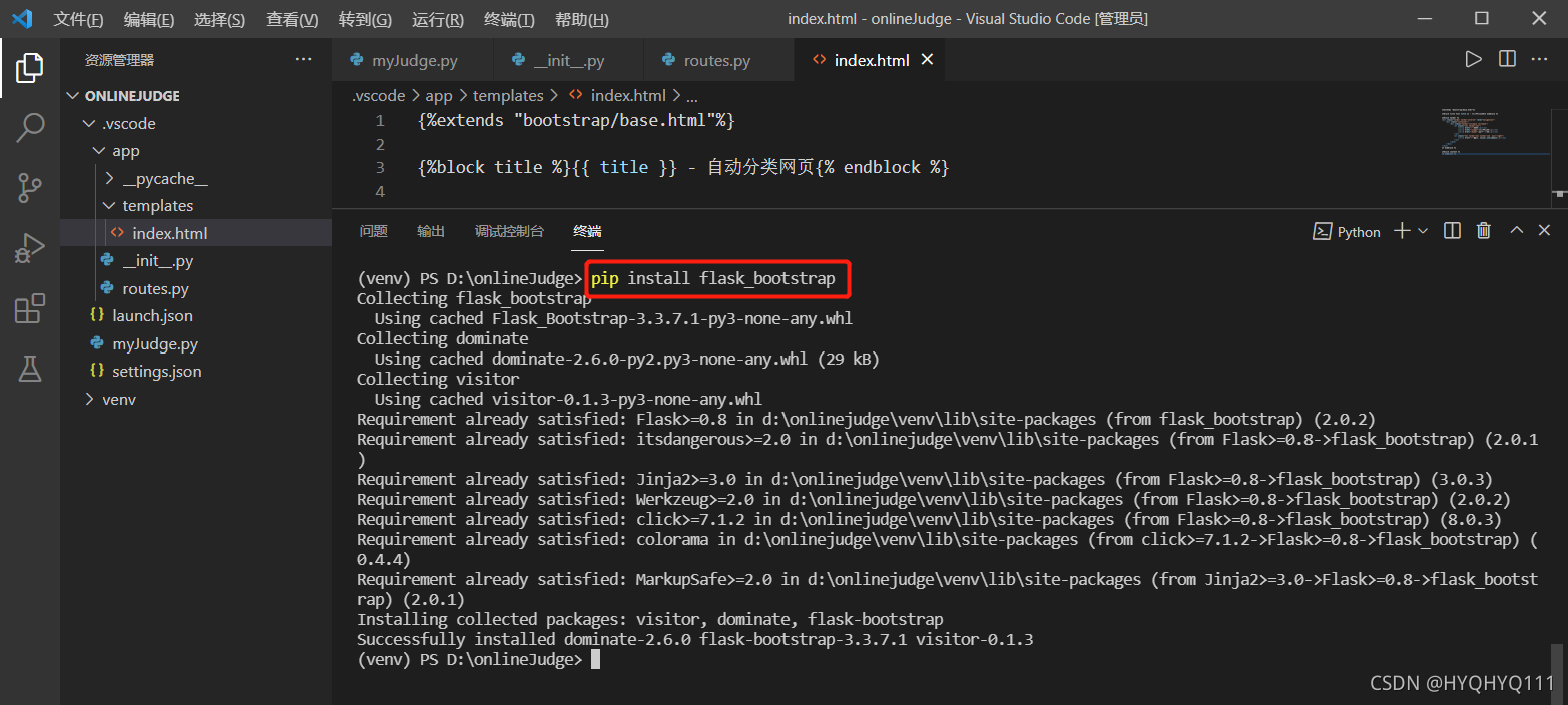 确定了要在网页中引入bootstrap框架,需要完成一点准备工作,即在项目中导入bootstrap,在终端执行【pip install flask_bootstrap】: