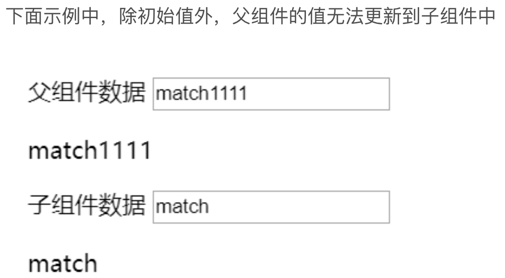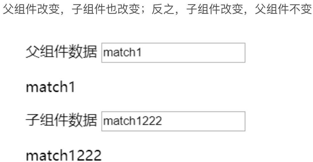 父组件数据变化时,子组件数据会相应变化;而子组件数据变化时,父组件数据不变,并在控制台显示警告 :