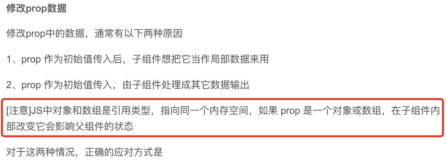 另外,每次父组件更新时,子组件的所有 prop 都会更新为最新值。这意味着不应该在子组件内部改变 prop。如果这么做了,Vue 会在控制台给出 警告