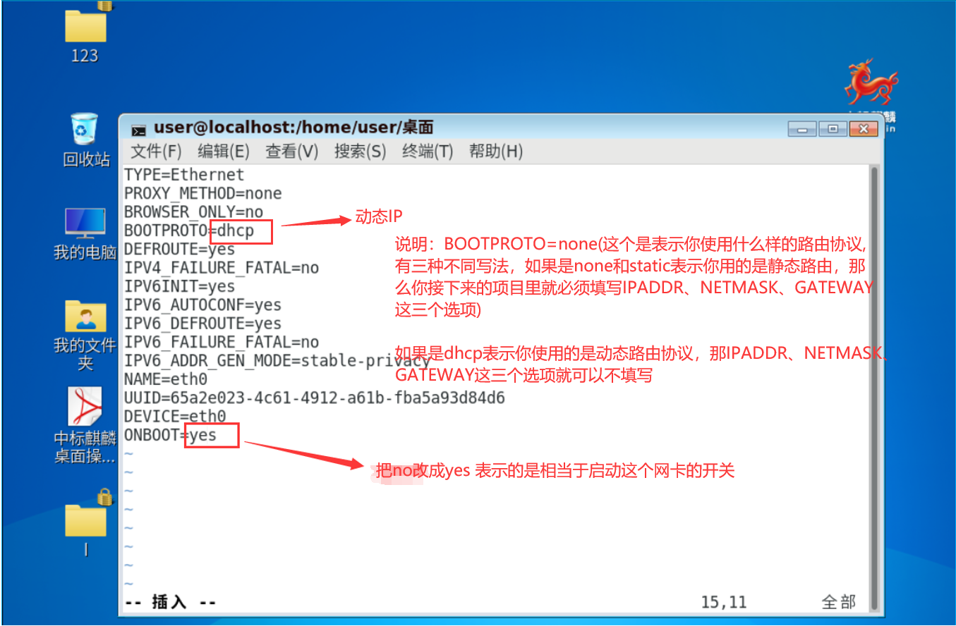 说明:BOOTPROTO=none(这个是表示你使用什么样的路由协议,有三种不同写法,如果是