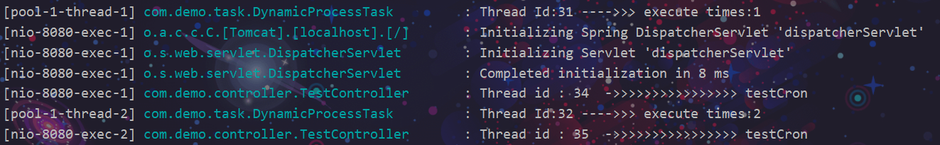 logger.info("Thread id : {} ->>>>>>>>>>>>>>>> testCron",Thread.currentThread().getId());
