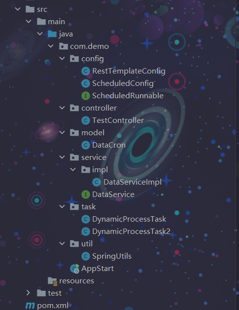 该动态定时任务主配置类是 ScheduledConfig,代码如下;