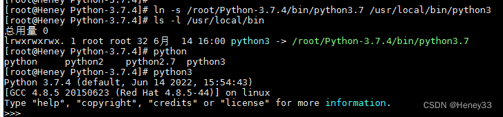 Linux已经安装了python2.7.5,但我们不能将它删除,如果删除,系统可能会出现不可预知的问题。我们只需要按照与Python2.7.5相同的方式为Python3.7.4创建一个软链接即可,我们把软链接放到/usr/local/bin目录下,如图: