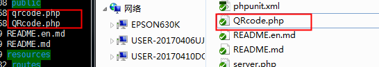 左面是我线上的目录,小写的qrcode.php 和 大写的QRcode.php 都有,这个不是我们想要的结果