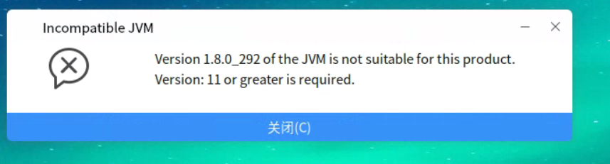 JVM的不兼容JVM版本1.8.0292不适用于此产品版本:需要ll或更高版本